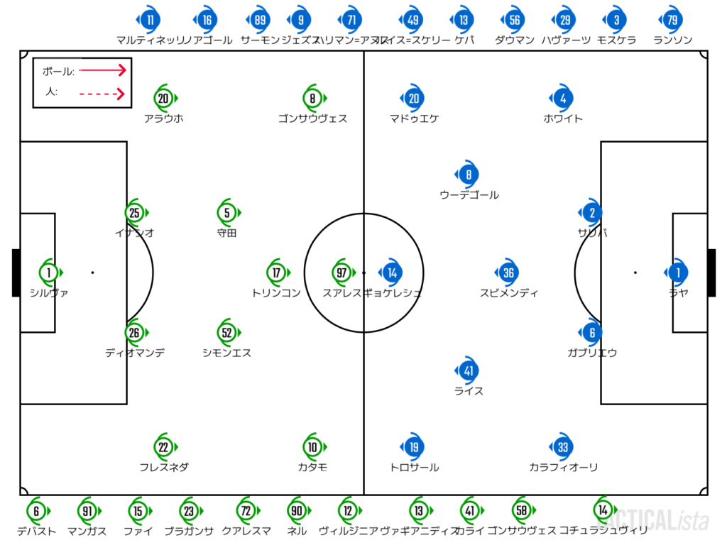 ゆったりとした流れの中でも右サイドのカタモを軸とした枚数をかけた攻撃で勝負に出るスポルティング。静的な状態でもアーセナルと同じくらいには押し込みながら勝負手を探ることができていた印象だ。