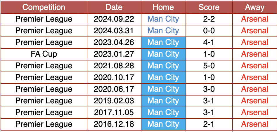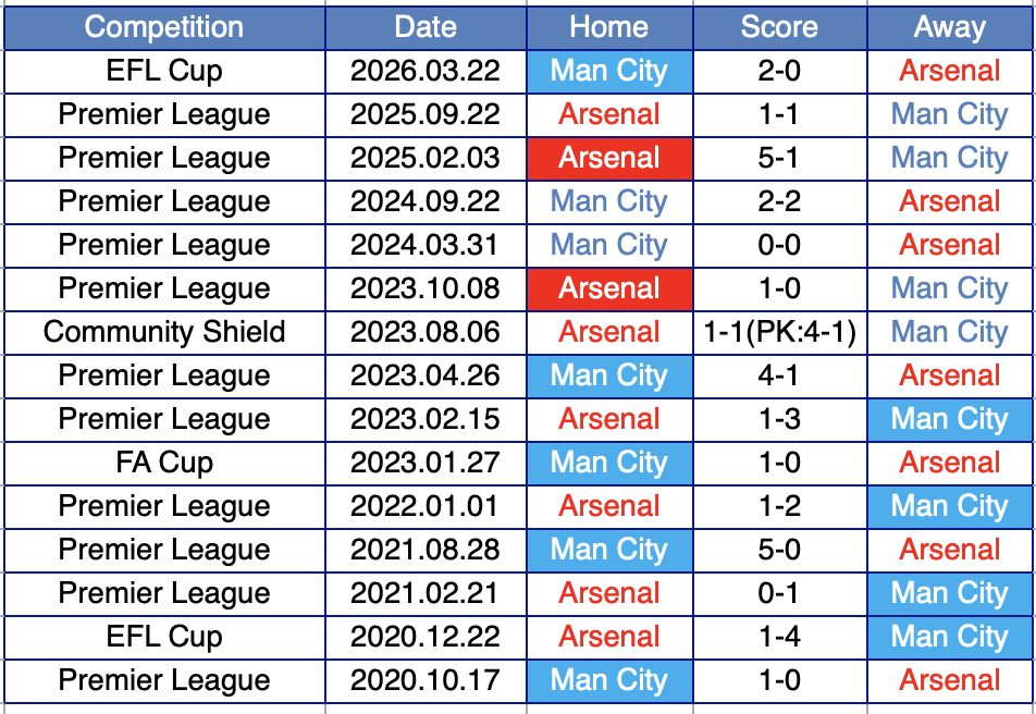 過去5年間の対戦でマンチェスター・シティの9勝、アーセナルの2勝、引き分けが4つ。