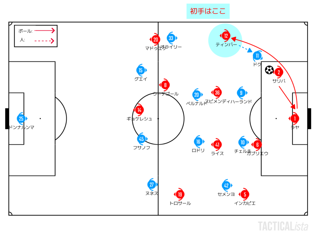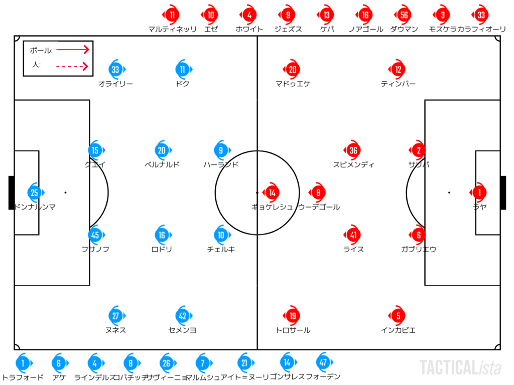 シティのSBを引き出し、CBが広範囲をカバーする状況を作った時に罰を与えられるかどうか。ここで重要になるのはラヤの配球とSBの判断。この観点で言えば、右はティンバーの復帰が望ましい。