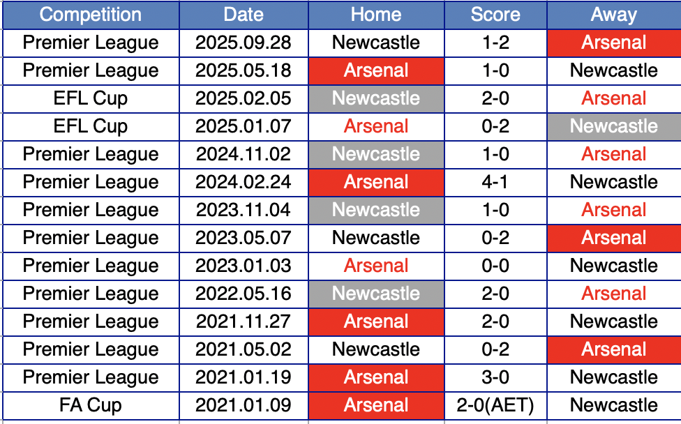 過去5年間の対戦でアーセナルの8勝、ニューカッスルの5勝、引き分けが1つ。