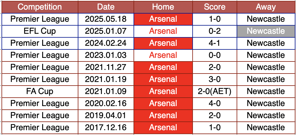 直近10回の対戦でアーセナルが8勝、ニューカッスルが1勝、引き分けが1つ。
