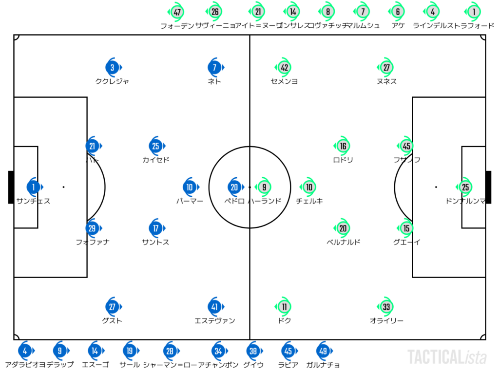 Man City:51′ オライリー, 57′ グエーイ, 68′ ドク