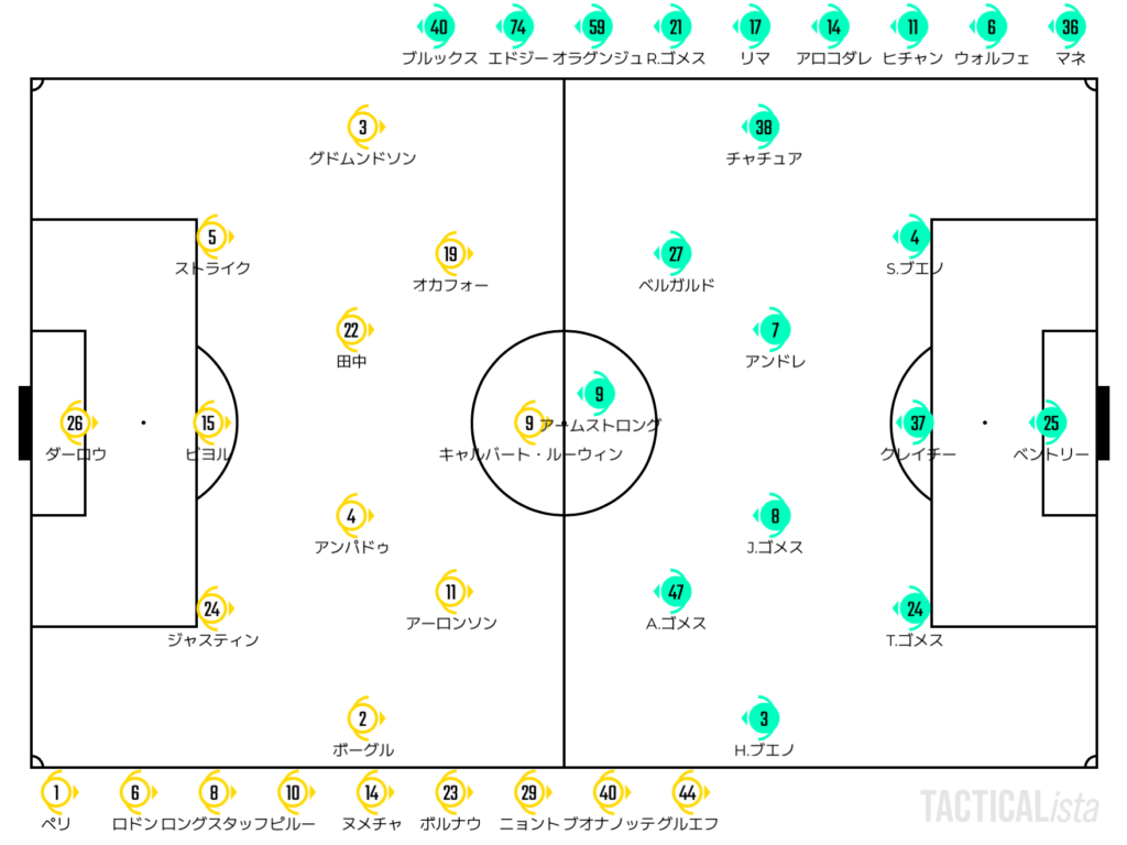 LEE:18′ ジャスティン, 20′ オカフォー, 90+5′(PK) キャルバート=ルーウィン