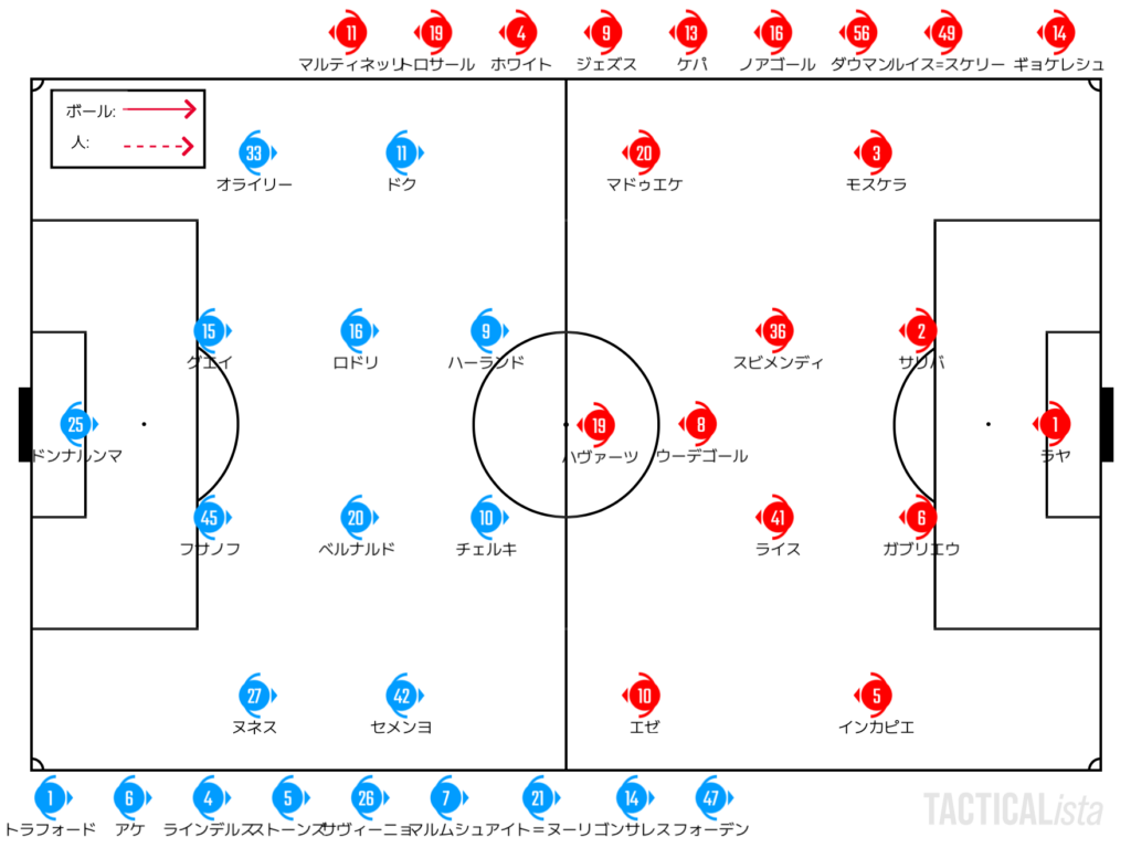 後半、マルティネッリを投入したアーセナルはプレスを強化。右サイドで外切りを加え、グエイを追い込む手段を増やす。中央やや左に人数をかけてパスの受け手を増やしたシティが押し込む時間を作るが、マルティネッリのプレスから決定機を迎えるなど、交代の効果も見られた。