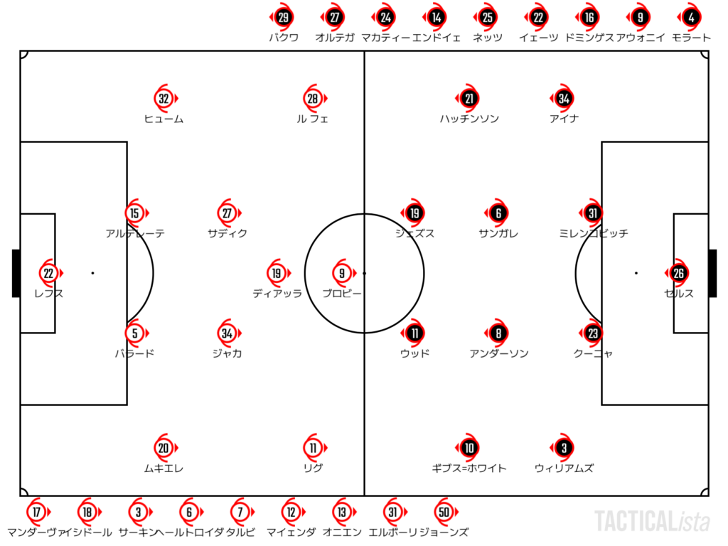 NFO:17′ ヒューム(OG), 31′ ウッド, 34′ ギブス=ホワイト, 37′ ジェズス, 90+5′ アンダーソン
