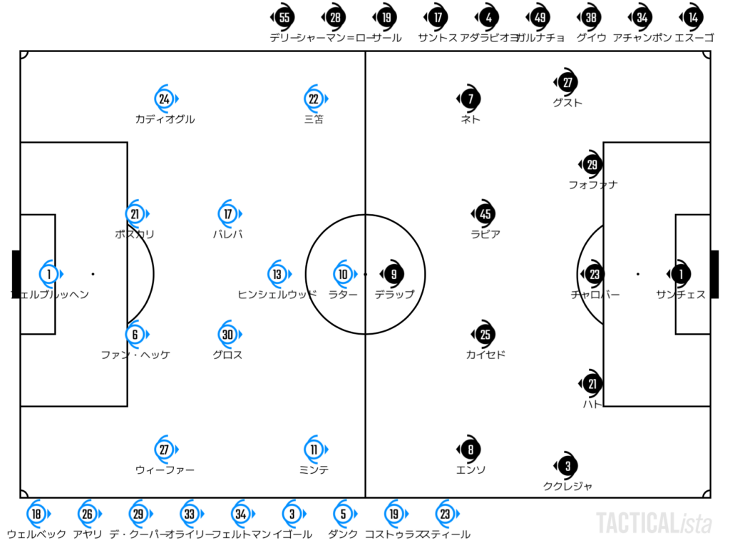 しかし、このプレスはあまり整理されておらず、ブライトンは右サイドからあっさりと前進に成功。ファーサイドの三笘へのクロスに対してネトがマークを外したことで、最終ラインを5枚で揃えた意味もほとんど感じられない形となった。