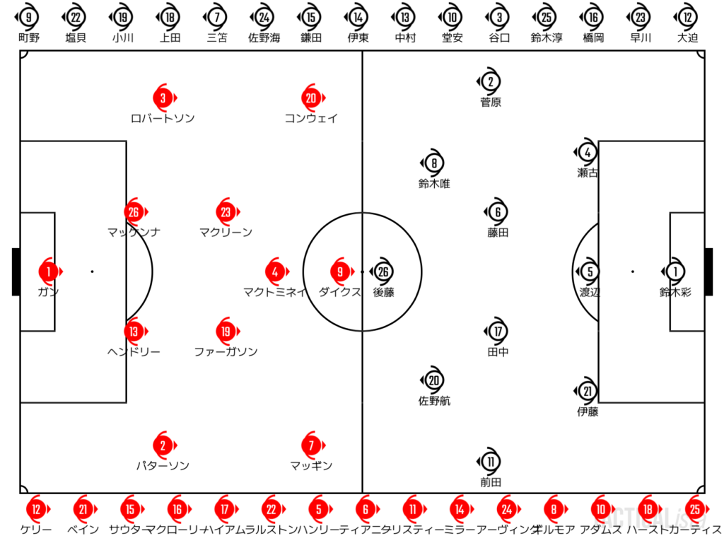 ダイクスには挟みながらの対応で少しずつ落ち着きを取り戻す日本。ロングボール一辺倒では難しいと判断したスコットランドは、中央でファーガソンがサリーしながら枚数を増やし、サイドにボールを散らしていく。