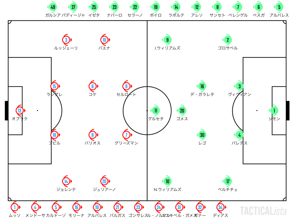 序盤からボールを持つのはビルバオ。CHがサリーし、SBが高い位置を取る構造からズレを作っていく。右のSHのイニャキはやや絞り気味。大外の幅取りはニコとゴロサベルが基本的に務める。押し下げる機会を得たビルバオはセットプレーからファーのグルセタが抜け出すが、これはオブラクのファインセーブで凌ぐ。